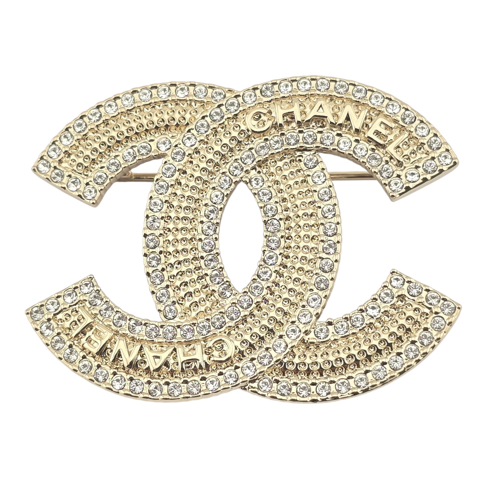 Chanel gold metal brooch with CHANEL engraving and clear crystals