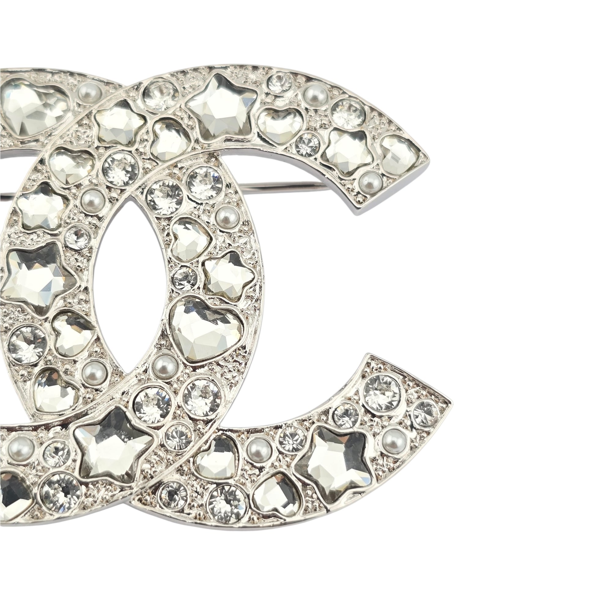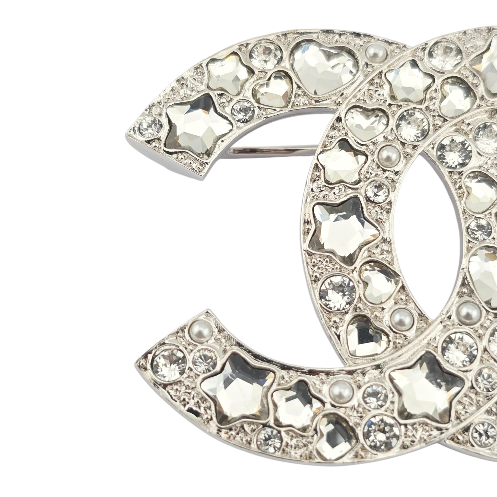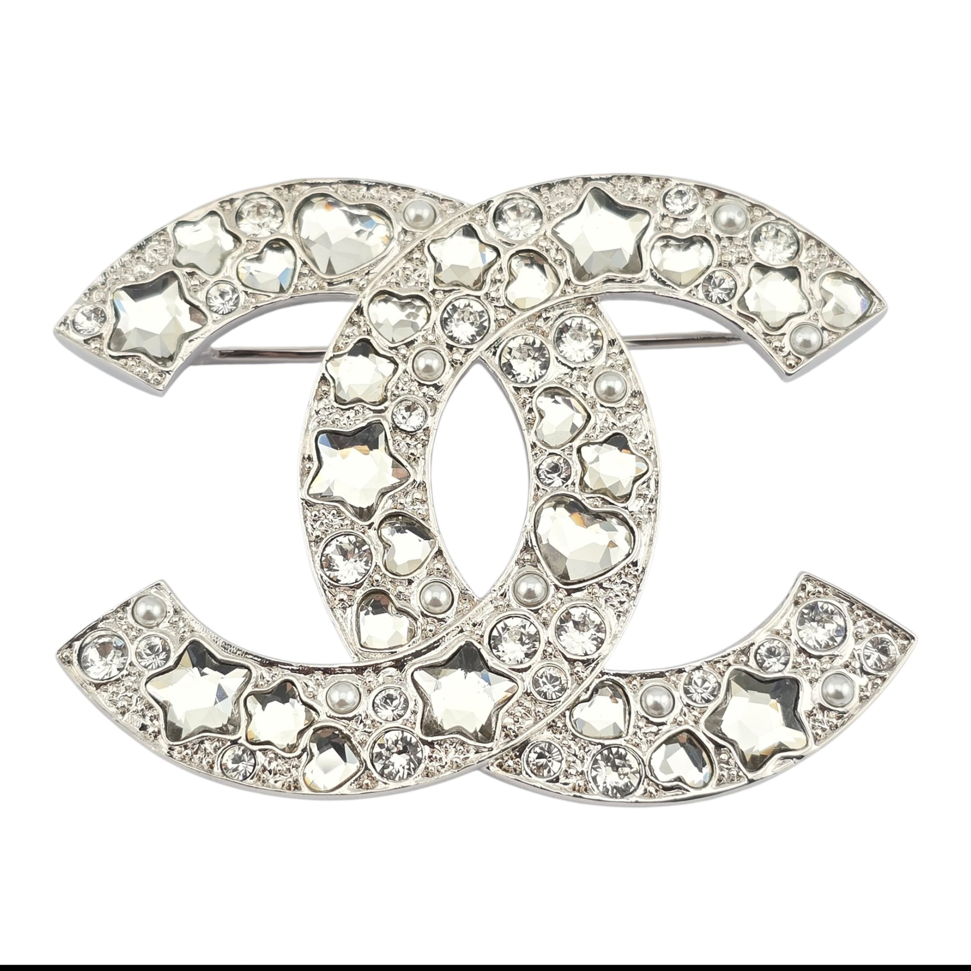 CHANEL SILVER CRYSTAL STAR HEART BROOCH F25
