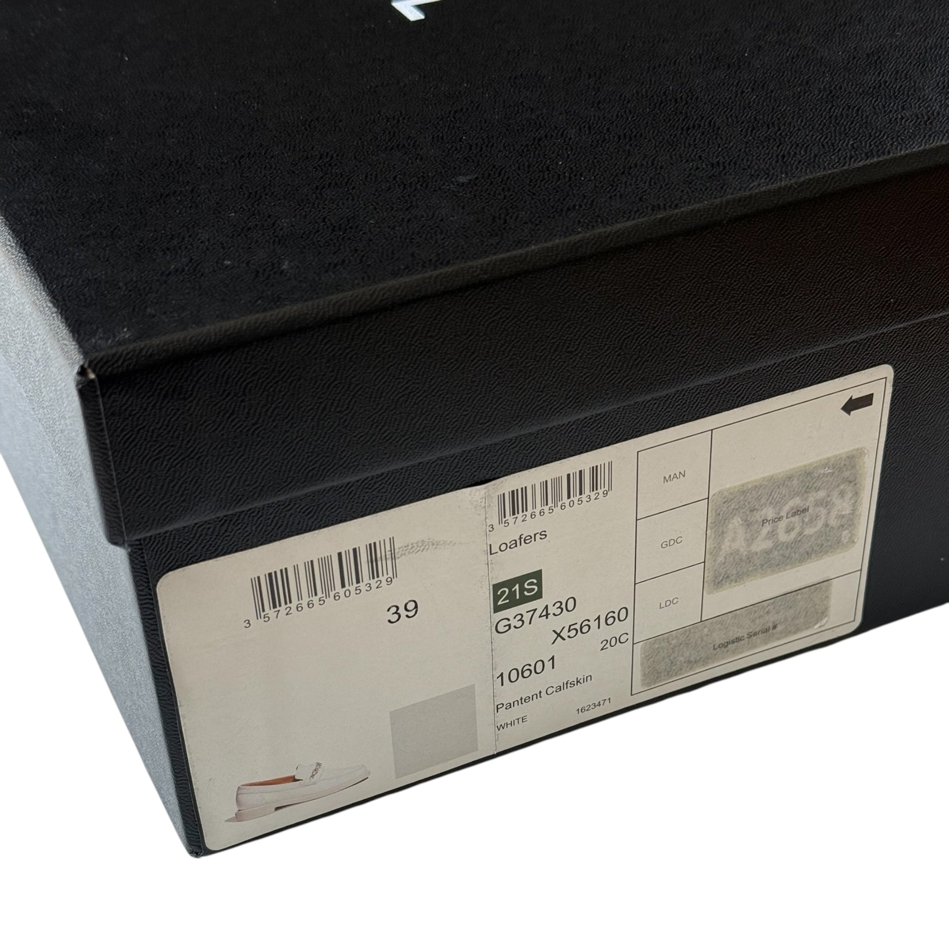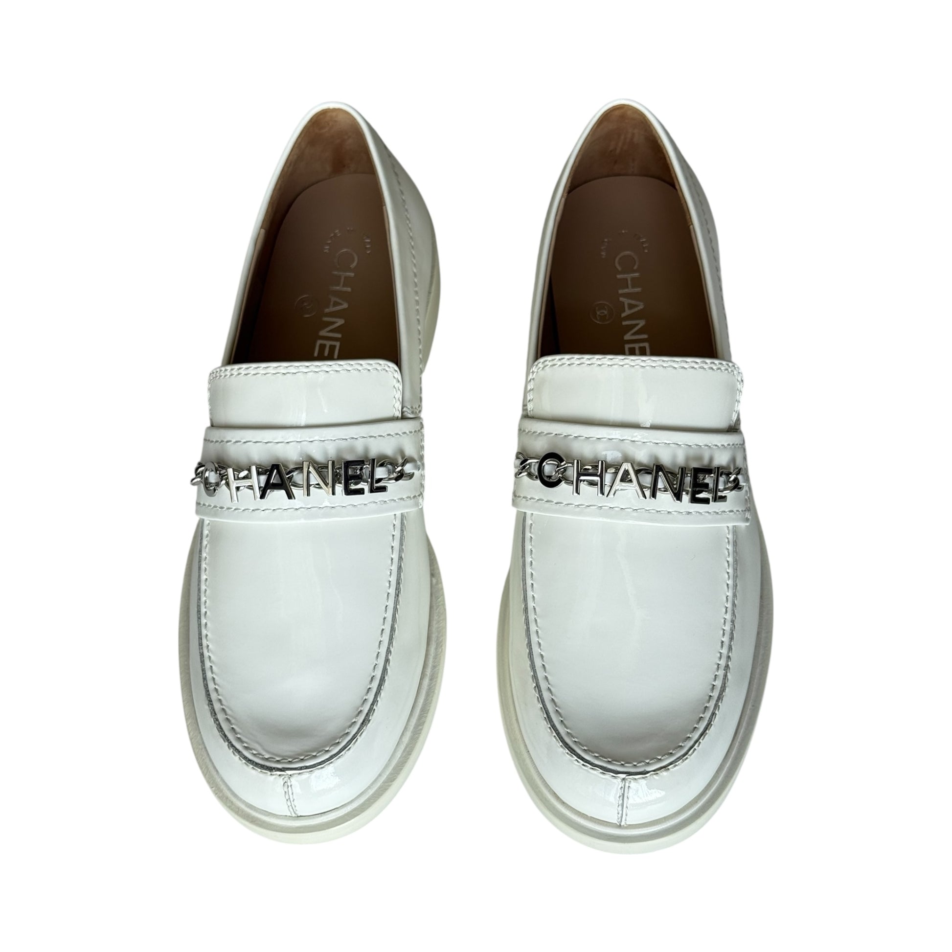 CHANEL WHITE SHINY CALFSKIN LOGO LOAFERS - 39